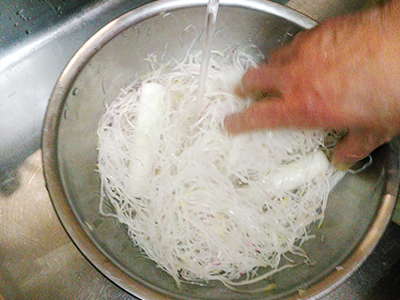 魚を下ろすときは内臓などを取って洗うのですが何か違うなって。ミネラルクリスターの水で洗うと匂いとか落ちるような気がしますね。また、大根のツマは一旦水でさらしますが、色持ちがいいですね。水道水では黄色に変りやすいです。普段水洗いなどで手が荒れる方ですが、水道水と比べると手荒れが少ないです。